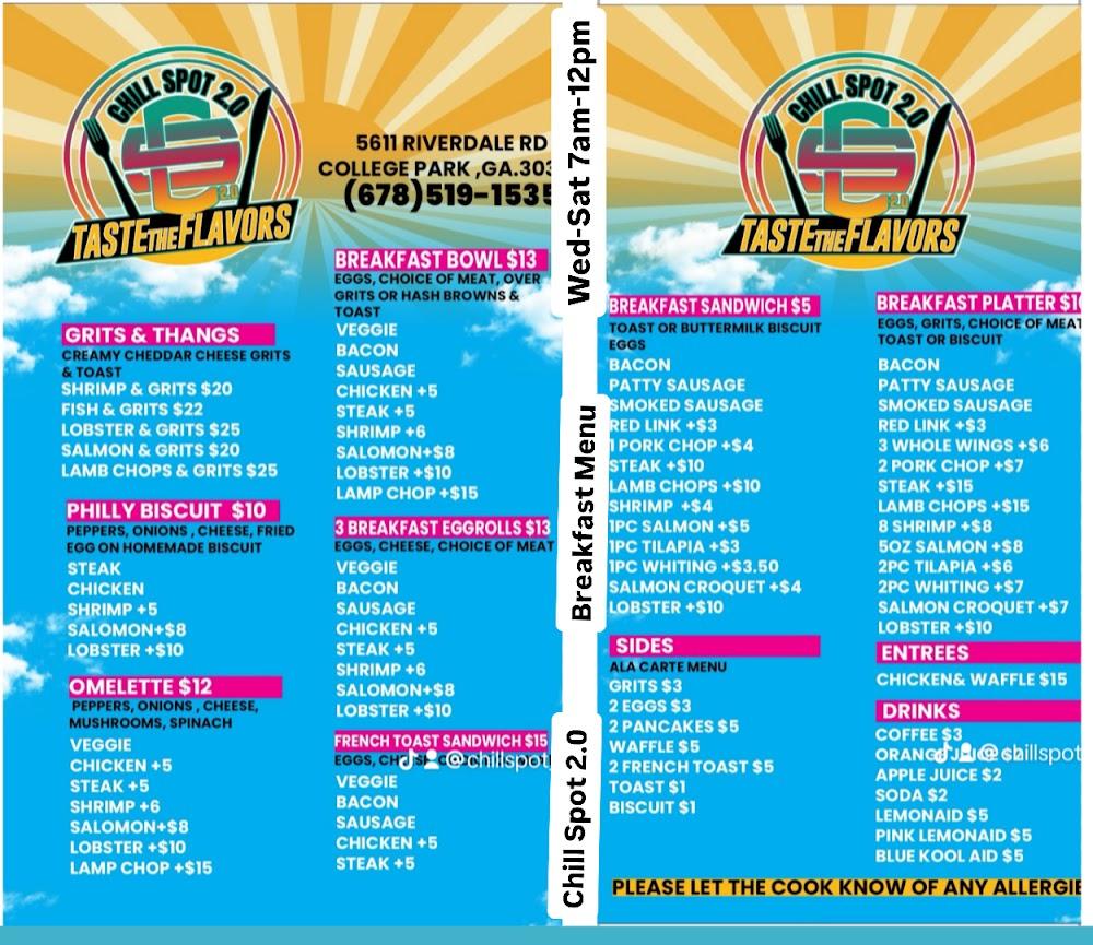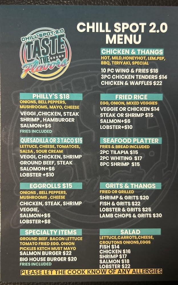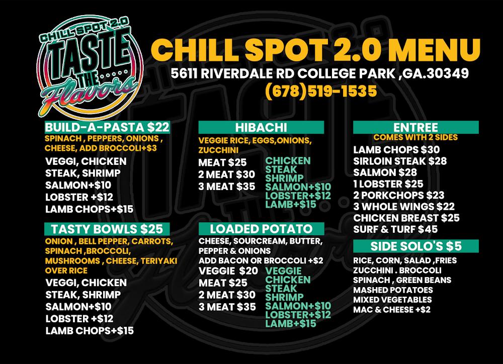 Welcome to Chillspot 2.0 Taste of Flavors, a vibrant haven for food lovers in Atlanta! Owned by a talented 20-year-old chef, our establishment features a delightful fusion of American cuisine, expertly crafted with love and passion. Enjoy a diverse menu that caters to all tastes, whether dining in, taking out, or enjoying our food truck offerings. We pride ourselves on being a Black-owned business that celebrates inclusivity, with a welcoming atmosphere for everyone. Join us for exceptional meals, outstanding cocktails, and a true taste of flavor that you won't forget. Visit us at 5611 Riverdale Rd, College Park, GA!