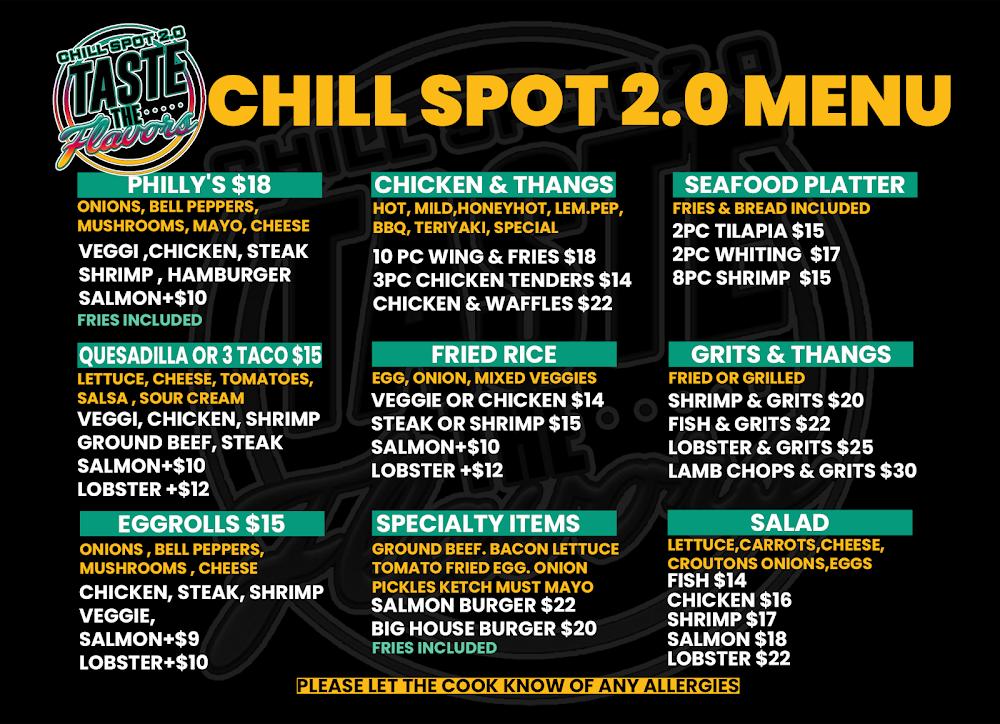 The menu at Chillspot 2.0 Taste of Flavors showcases diversity. The offerings span categories, ensuring something for everyone. The standout includes the delicious oxtail cornbread bowl. In addition, don't miss the tantalizing burgers; they are simply excellent. There's a mix of chicken dishes, fried rice options, and seafood platters that impress. Veggie lovers enjoy hearty selections too, satisfying every palate. Each dish reflects the chef's dedication and flair. He balances tradition with modern flavors creatively. Special items like the breakfast offerings round out an already exciting menu. Each dish crafted with care waits to delight every guest. Prices are also reasonable, making food accessible without sacrificing quality. This diverse menu invites you to discover comforting classics while trying new flavors.